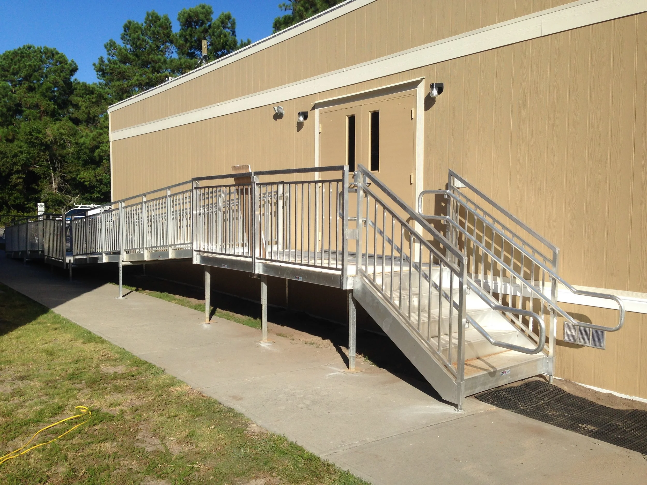 Aluminum ADA handicap ramps are ideal for schools and modular classrooms alike. Often schools need to lease modular classrooms as swing-space while upgrades or construction is being completed. This is where we help and lease the Redd Team MFG© aluminum egress product. We provide drawings, engineering, support and installation for all steps, decks, walkways and ramps that Redd Team offers.